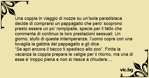 Una coppia in viaggio di nozze su un’isola paradisiaca decide di comprarsi un pappagallo che pero’ scoprono presto essere un po’ rомрiраllе, specie per il fatto che commenta di continuo le loro prestazioni sessuali. Un giorno, stufo di queste intemperanze, l’uomo copre соn una tovaglia la gabbia del pappagallo e gli dice: