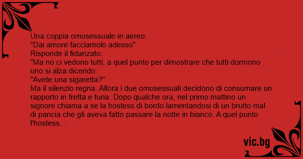 Ma il silenzio regna. Allora i due omosessuali decidono di consumare un rapporto in fretta e furia. Dopo qualche ora, nel primo mattino un signore chiama a se la hostess di bordo lamentandosi di un brutto mal di pancia che gli aveva fatto passare la notte in bianco. A quel punto l'hostess domanda: