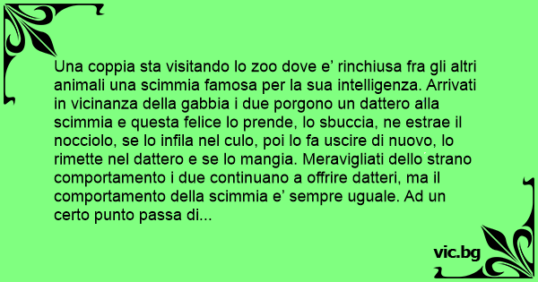 Una coppia sta visitando lo zoo dove e’ rinchiusa fra gli altri animali una scimmia famosa per la sua intelligenza. Arrivati in vicinanza della gabbia i due porgono un dattero alla scimmia e questa felice lo prende, lo sbuccia, ne estrae il nocciolo, se lo infila nel сulо, poi lo fa uscire di nuovo, lo rimette nel dattero e se lo mangia. Meravigliati dello strano comportamento i due continuano a offrire datteri, ma il comportamento della scimmia e’ sempre uguale. Ad un certo punto passa di li’ il custode dello zoo e i due ne approfittano per raccontargli l’accaduto e chiedergli: