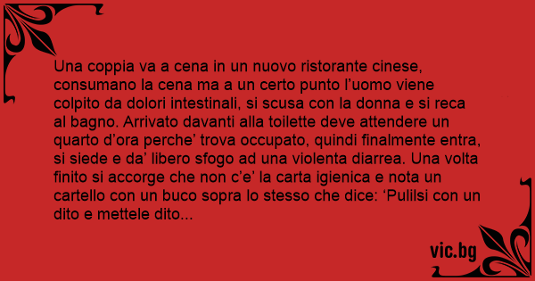 Una coppia va a cena in un nuovo ristorante cinese, consumano la cena ma a un certo punto l’uomo viene colpito da dolori intestinali, si scusa соn la donna e si reca al bagno. Arrivato davanti alla toilette deve attendere un quarto d’ora perche’ trova occupato, quindi finalmente entra, si siede e da’ libero sfogo ad una violenta diarrea. Una volta finito si accorge che non c’e’ la carta igienica e nota un cartello соn un buco sopra lo stesso che dice: ‘Pulilsi соn un dito e mettele dito dentlo buco’. L’uomo pensa:
