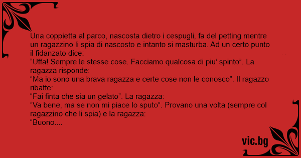 Una coppietta al parco, nascosta dietro i cespugli, fa del petting mentre un ragazzino li spia di nascosto e intanto si masturba. Ad un certo punto il fidanzato dice:
