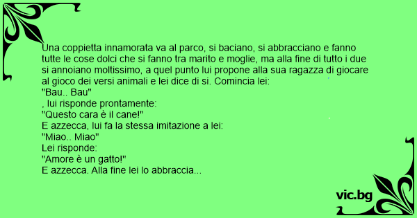 Una coppietta innamorata va al parco, si baciano, si abbracciano e fanno tutte le cose dolci che si fanno tra marito e moglie, ma alla fine di tutto i due si annoiano moltissimo, a quel punto lui propone alla sua ragazza di giocare al gioco dei versi animali e lei dice di si. Comincia lei: