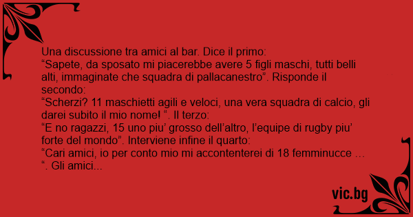 “Sapete, da sposato mi piacerebbe avere 5 figli maschi, tutti belli alti, immaginate che squadra di pallacanestro”. Risponde il secondo: