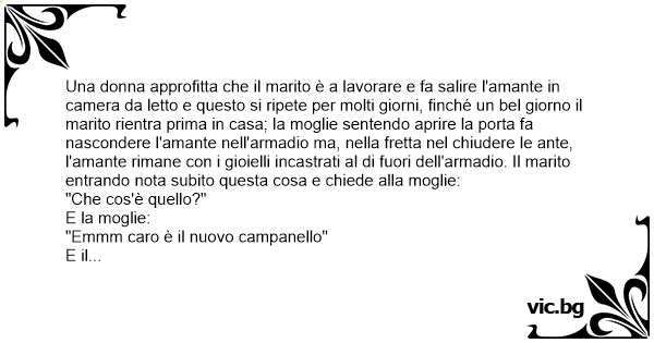 Una donna approfitta che il marito è a lavorare e fa salire l'amante in camera da letto e questo si ripete per molti giorni, finché un bel giorno il marito rientra prima in casa; la moglie sentendo aprire la porta fa nascondere l'amante nell'armadio ma, nella fretta nel chiudere le ante, l'amante rimane соn i gioielli incastrati al di fuori dell'armadio. Il marito entrando nota subito questa cosa e chiede alla moglie: