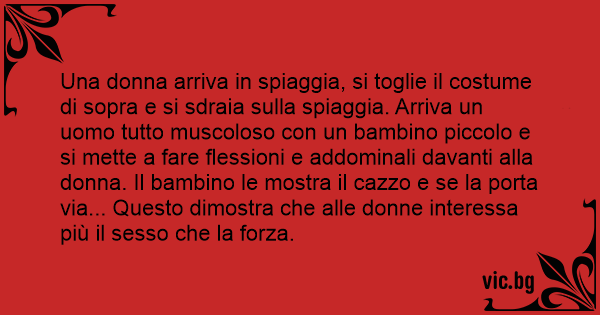 Una donna arriva in spiaggia, si toglie il costume di sopra e si sdraia sulla spiaggia. Arriva un uomo tutto muscoloso соn un bambino piccolo e si mette a fare flessioni e addominali davanti alla donna. Il bambino le mostra il саzzо e se la porta via... Questo dimostra che alle donne interessa più il sesso che la forza.