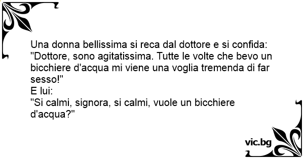 "Dottore, sono agitatissima. Tutte le volte che bevo un bicchiere d'acqua mi viene una voglia tremenda di far sesso!"
