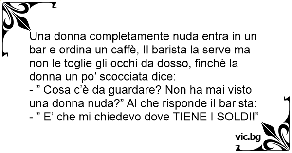 Una donna completamente nuda entra in un bar e ordina un caffè, Il barista la serve ma non le toglie gli occhi da dosso, finchè la donna un po’ scocciata dice:
