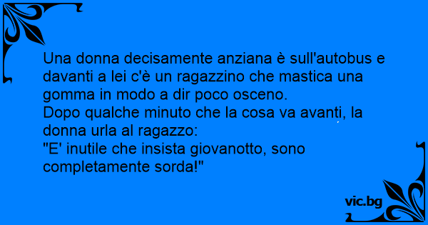 Una vecchietta sull’autobus e’ in piedi di fronte ad un giovanotto che mastica una gomma. La vecchietta lo osserva per alcuni minuti e poi si rivolge al ragazzo ad alta voce: “E’ inutile che...