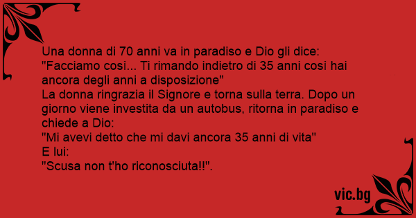 C'est une vieille dame de 75 ans qui a une vision une nuit, elle voit Dieu et lui parle. Elle lui demande : "Combien de temps me reste-t-il à vivre?" Dieu lui répond: "Il te reste encore 35 ans à...