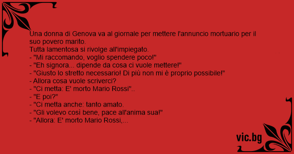 Una donna di Genova va al giornale per mettere l'annuncio mortuario per il suo povero marito.