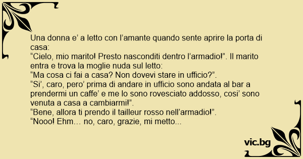 “Cielo, mio marito! Presto nasconditi dentro l’armadio!”. Il marito entra e trova la moglie nuda sul letto: