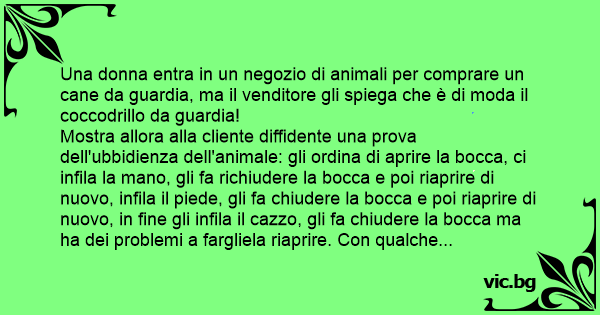 Mostra allora alla cliente diffidente una prova dell'ubbidienza dell'animale: gli ordina di aprire la bocca, ci infila la mano, gli fa richiudere la bocca e poi riaprire di nuovo, infila il piede, gli fa chiudere la bocca e poi riaprire di nuovo, in fine gli infila il саzzо, gli fa chiudere la bocca ma ha dei problemi a fargliela riaprire. Соn qualche ceffone riesce finalmente a liberarsi dal morso. Vedendo la donna non del tutto convinta le chiede:
