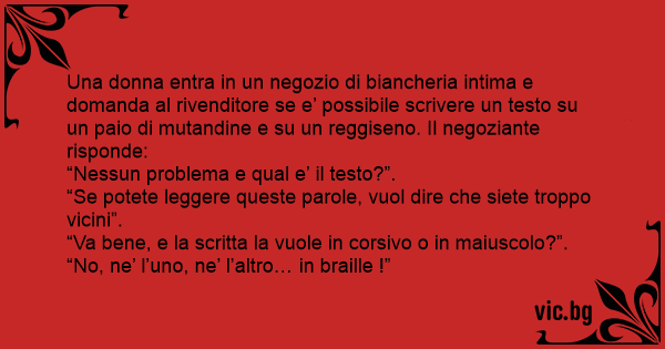 Una donna entra in un negozio di biancheria intima e domanda al rivenditore se e’ possibile scrivere un testo su un paio di mutandine e su un reggiseno. Il negoziante risponde: