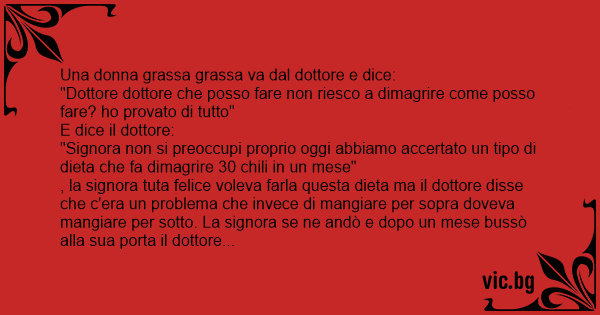 , la signora tuta felice voleva farla questa dieta ma il dottore disse che c'era un problema che invece di mangiare per sopra doveva mangiare per sotto. La signora se ne andò e dopo un mese bussò alla sua porta il dottore e quando aprì vide la signora abbastanza magra che muoveva il bacino come un orologio e disse il dottore: