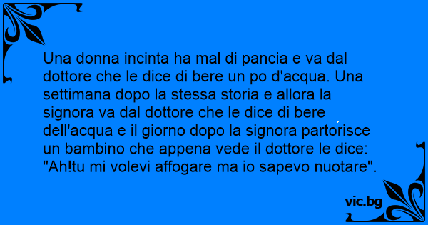 Una donna incinta ha mal di pancia e va dal dottore che le dice di bere un po d'acqua. Una settimana dopo la stessa storia e allora la signora va dal dottore che le dice di bere dell'acqua e il giorno dopo la signora partorisce un bambino che appena vede il dottore le dice: