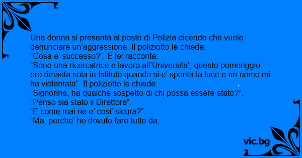 Una donna si presenta al posto di Polizia dicendo che vuole denunciare un’aggressione. Il poliziotto le chiede: