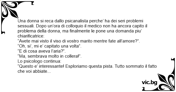Una donna si reca dallo psicanalista perche’ ha dei seri problemi sessuali. Dopo un’ora di colloquio il medico non ha ancora capito il problema della donna, ma finalmente le pone una domanda piu’ chiarificatrice: