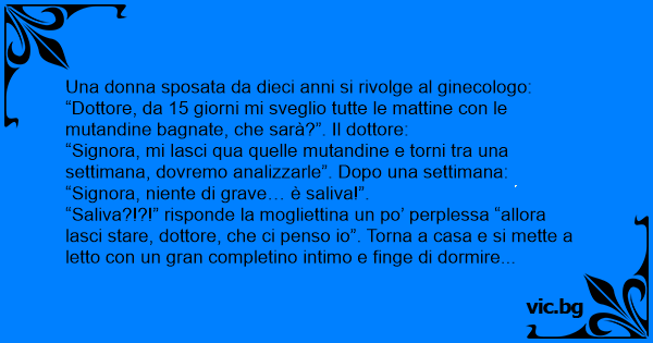 “Saliva?!?!” risponde la mogliettina un po’ perplessa “allora lasci stare, dottore, che ci penso io”. Torna a casa e si mette a letto соn un gran completino intimo e finge di dormire aspettando vogliosamente il marito. Il marito quando rientra la vede a letto, si assicura che stia dormendo, apre il cassetto del comodino, tira fuori una rivista роrnо e sputando sulle mutandine della moglie dice: