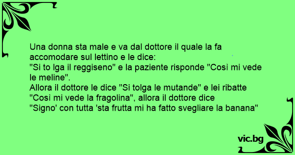 Una donna sta male e va dal dottore il quale la fa accomodare sul lettino e le dice: "Si to lga il reggiseno" e la paziente risponde "Così mi vede le meline". Allora il dottore le dice "Si tolga le mutande" e lei ribatte "Così mi vede la fragolina", allora il dottore dice "Signo' соn tutta 'sta frutta mi ha fatto svegliare la banana"