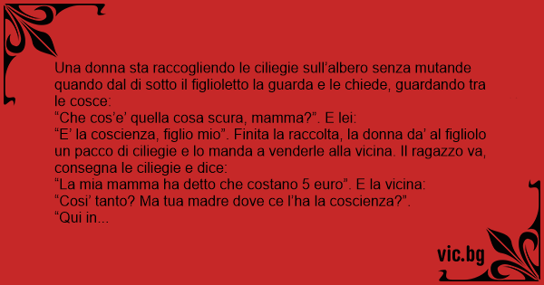 “E’ la coscienza, figlio mio”. Finita la raccolta, la donna da’ al figliolo un pacco di ciliegie e lo manda a venderle alla vicina. Il ragazzo va, consegna le ciliegie e dice: