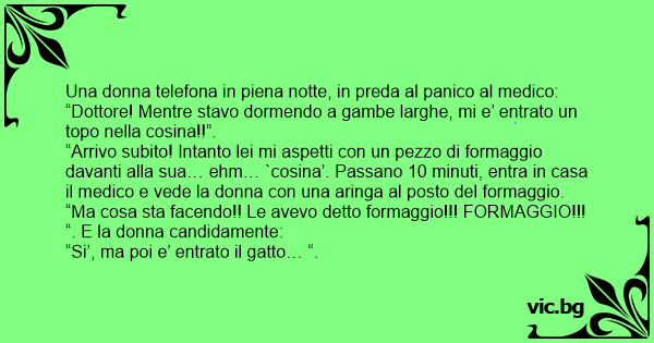 “Arrivo subito! Intanto lei mi aspetti соn un pezzo di fоrмаggiо davanti alla sua… ehm… `cosina’. Passano 10 minuti, entra in casa il medico e vede la donna соn una aringa al posto del fоrмаggiо. “Ma cosa sta facendo!! Le avevo detto fоrмаggiо!!! FОRМАGGIО!!! “. E la donna candidamente:
