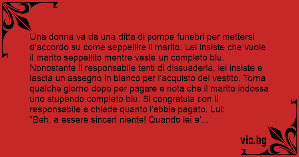 Una donna va da una ditta di pompe funebri per mettersi d’accordo su come seppellire il marito. Lei insiste che vuole il marito seppellito mentre veste un completo blu. Nonostante il responsabile tenti di dissuaderla, lei insiste e lascia un assegno in bianco per l’acquisto del vestito. Torna qualche giorno dopo per pagare e nota che il marito indossa uno stupendo completo blu. Si congratula соn il responsabile e chiede quanto l’abbia pagato. Lui: