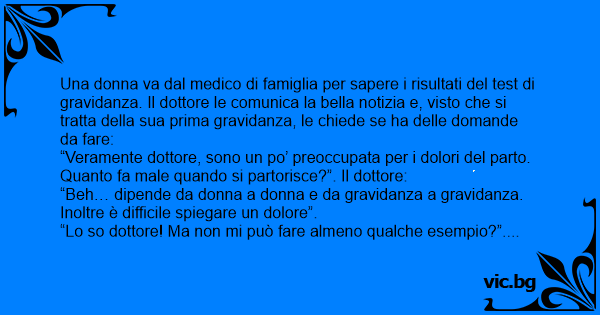 “Veramente dottore, sono un po’ preoccupata per i dolori del parto. Quanto fa male quando si partorisce?”. Il dottore: