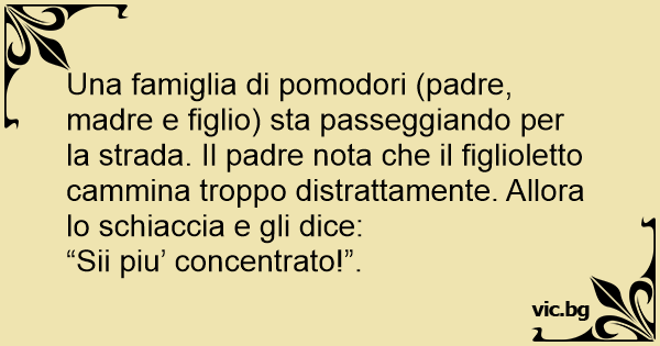 Una famiglia di pomodori (padre, madre e figlio) sta passeggiando per la strada. Il padre nota che il figlioletto cammina troppo distrattamente. Allora lo schiaccia e gli dice: