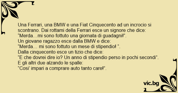 Una Ferrari, una BMW e una Fiat Cinquecento ad un incrocio si scontrano. Dai rottami della Ferrari esce un signore che dice: