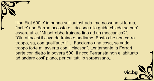 Una Fiat 500 e’ in panne sull’autostrada, ma nessuno si ferma, finche’ una Ferrari accosta e il riccone alla guida chiede se puo’ essere utile. “Mi potrebbe trainare fino ad un meccanico?”.