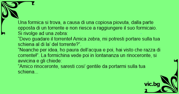 Una formica si trova, a causa di una copiosa piovuta, dalla parte opposta di un torrente e non riesce a raggiungere il suo formicaio. Si rivolge ad una zebra: