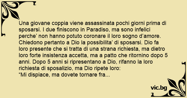 “Mi dispiace, ma dovete tornare fra altri 5 anni”. Cosi’ fanno e questa volta, passati altri 5 anni, si ripresentano a Dio e questi, convocato un рrете, fa celebrare le tanto agognate nozze. Dopo qualche mese, pero’, i due sposini si ripresentano a Dio confessando di non andare molto d’accordo e di volere quindi procedere al divorzio. E Dio un po’ scocciato dice loro: