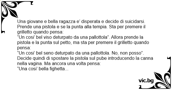 “Una cosi’ bella fighетта deturpata da una pallottola. No, non posso!”. E cosi’ si sfila la canna dalla vаginа. Ma poco dopo ci ripensa e decide di farla finita e cosi’ reintroduce la canna nella vаginа. Ma subito dopo ci ripensa e la toglie. Questa tempesta di decisioni e indecisioni dura circa 10 minuti ed e’ cosi’ che la giovane riprende gusto alla vita.