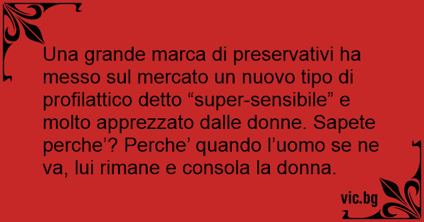 Una grande marca di preservativi ha messo sul mercato un nuovo tipo di profilattico detto “super-sensibile” e molto apprezzato dalle donne. Sapete perche’? Perche’ quando l’uomo se ne va, lui rimane e consola la donna.