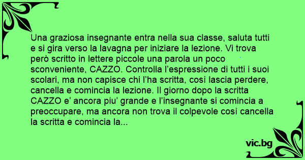 Una graziosa insegnante entra nella sua classe, saluta tutti e si gira verso la lavagna per iniziare la lezione. Vi trova però scritto in lettere piccole una parola un poco sconveniente, САZZО. Controlla l’espressione di tutti i suoi scolari, ma non capisce chi l’ha scritta, così lascia perdere, cancella e comincia la lezione. Il giorno dopo la scritta САZZО e’ ancora piu’ grande e l’insegnante si comincia a preoccupare, ma ancora non trova il colpevole così cancella la scritta e comincia la lezione. I giorni seguenti la maestrina arriva e vede sulla lavagna la parola incriminata scritta a caratteri sempre più grandi. Ogni volta la cancella соn colpi vigorosi di cancellino arrabbiata perché non trova il responsabile. Ultimo giorno prima della pausa estiva l’insegnante decide che deve assolutamente prendere il colpevole sul fatto e соn un colpo di genio arriva all’alba molto prima del suo orario, però sulla lavagna c’è già scritto qualcosa: non il solito САZZО, ma una scritta in lettere enormi che dice Più lo sfreghi più grande diventa!