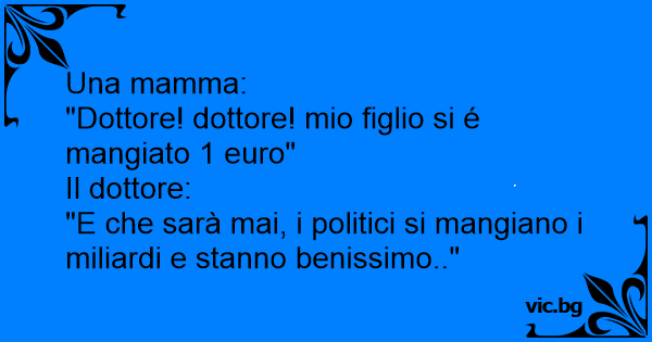 Un padre alle prime armi chiama disperato il pediatra dicendo: "Dottore, dottore, mi aiuti, la prego! Mio figlio ha mangiato un euro, pensa che possa morire?" Ed il medico in tutta serenità risponde: "Non si preoccupi, i politici del nostro paese si sono mangiati milioni di euro e sono ancora...