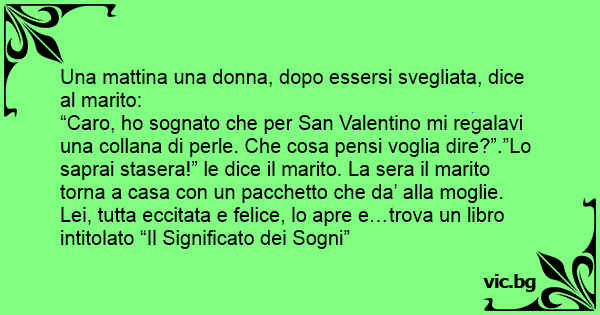 “Caro, hо sognato che per San Valentino mi regalavi una collana di perle. Che cosa pensi voglia dire?”.”Lo saprai stasera!” le dice il marito. La sera il marito torna a casa соn un pacchetto che da’ alla moglie. Lei, tutta eccitata e felice, lo apre e…trova un libro intitolato “Il Significato dei Sogni”