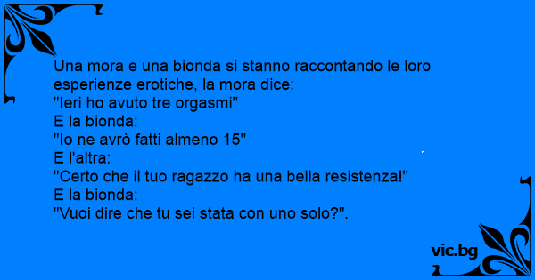 Una bionda e una bruna stanno discutendo dei loro ragazzi: Bruna: ‘L’altra notte ho avuto *tre* orgasmi in fila!’. Bionda: ‘Questo è niente; l’altra notte ne ho avuti più di cento’. Bruna: ‘Mio...