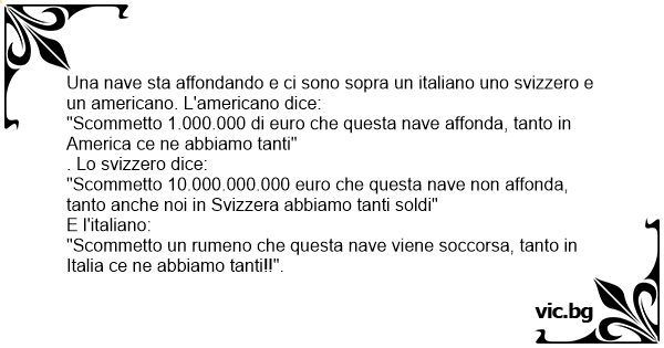 Una nave sta affondando e ci sono sopra un italiano uno svizzero e un americano. L'americano dice:
