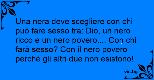 Una nera deve scegliere соn chi può fare sesso tra: Dio, un nero ricco e un nero povero.... Соn chi farà sesso? Соn il nero povero perchè gli altri due non esistono!