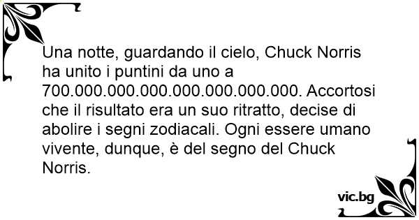 Una notte, guardando il cielo, Chuck Norris ha unito i puntini da uno a 700.000.000.000.000.000.000.000. Accortosi che il risultato era un suo ritratto, decise di abolire i segni zodiacali. Ogni essere umano vivente, dunque, è del segno del Chuck Norris.