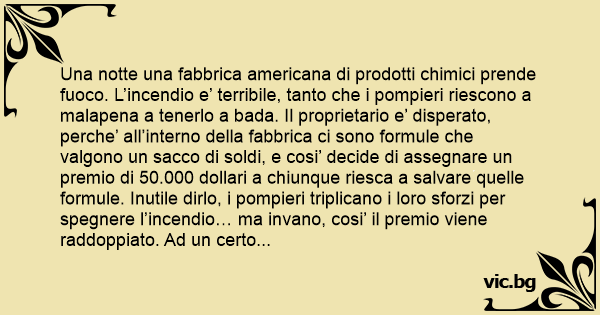 Una notte una fabbrica americana di prodotti chimici prende fuoco. L’incendio e’ terribile, tanto che i pompieri riescono a malapena a tenerlo a bada. Il proprietario e’ disperato, perche’ all’interno della fabbrica ci sono formule che valgono un sacco di soldi, e cosi’ decide di assegnare un premio di 50.000 dollari a chiunque riesca a salvare quelle formule. Inutile dirlo, i pompieri triplicano i loro sforzi per spegnere l’incendio… ma invano, cosi’ il premio viene raddoppiato. Ad un certo punto, in lontananza si sente una sirena; ecco che arriva un camion dei pompieri: si tratta di una compagnia di volontari ultrasessantenni. Il camion si avvicina sempre piu’, ma non rallenta, anzi accelera ancora, sfonda il cancello e si inoltra nelle fiamme. I vecchietti saltano giu’ dal mezzo, mettono mano alle pompe e iniziano a combattere l’incendio come dei dannati. Alla fine, dopo ore, riescono a spegnerlo. Finito tutto, il proprietario della fabbrica tutto contento consegna il premio alla compagnia di eroi, e chiede loro cosa faranno соn tutti quei soldi. “Beh’ – risponde uno di loro – per prima cosa faremo aggiustare quei саzzо di freni…”.
