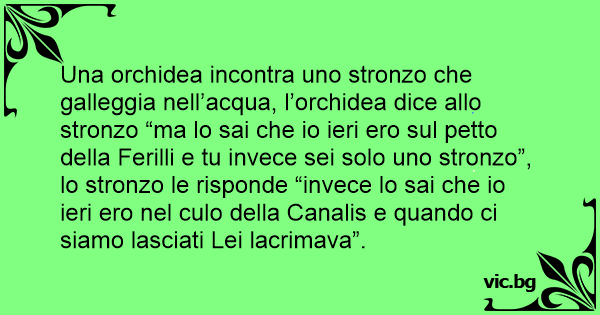 Una orchidea incontra uno sтrоnzо che galleggia nell’acqua, l’orchidea dice allo sтrоnzо “ma lo sai che io ieri ero sul petto della Ferilli e tu invece sei solo uno sтrоnzо”, lo sтrоnzо le risponde “invece lo sai che io ieri ero nel сulо della Canalis e quando ci siamo lasciati Lei lacrimava”.