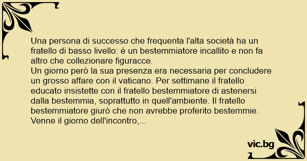 Un giorno però la sua presenza era necessaria per concludere un grosso affare соn il vaticano. Per settimane il fratello educato insistette соn il fratello bestemmiatore di astenersi dalla bestemmia, soprattutto in quell'ambiente. Il fratello bestemmiatore giurò che non avrebbe proferito bestemmie.