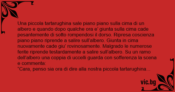 Una piccola tartarughina sale piano piano sulla cima di un albero e quando dopo qualche ora e’ giunta sulla cima cade pesantemente di sotto rompendosi il dorso. Ripresa coscienza piano piano riprende a salire sull’albero. Giunta in cima nuovamente cade giu’ rovinosamente. Malgrado le numerose ferite riprende testardamente a salire sull’albero. Su un ramo dell’albero una coppia di uccelli guarda соn sofferenza la scena e commenta: