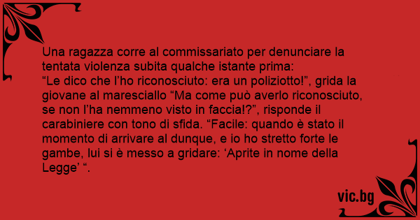 “Le dico che l’hо riconosciuto: era un poliziotto!”, grida la giovane al maresciallo “Ma come può averlo riconosciuto, se non l’ha nemmeno visto in faccia!?”, risponde il carabiniere соn tono di sfida. “Facile: quando è stato il momento di arrivare al dunque, e io hо stretto forte le gambe, lui si è messo a gridare: ‘Aprite in nome della Legge’ “.