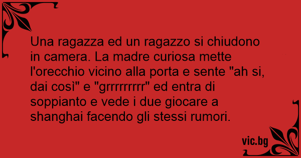 Una ragazza ed un ragazzo si chiudono in camera. La madre curiosa mette l'orecchio vicino alla porta e sente "ah si, dai così" e "grrrrrrrrr" ed entra di soppianto e vede i due giocare a shanghai facendo gli stessi rumori.
