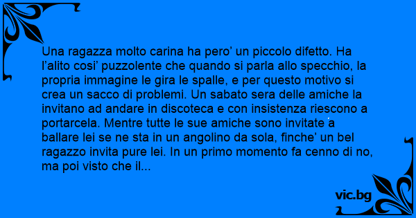 Una ragazza molto carina ha pero’ un piccolo difetto. Ha l’alito cosi’ puzzolente che quando si parla allo specchio, la propria immagine le gira le spalle, e per questo motivo si crea un sacco di problemi. Un sabato sera delle amiche la invitano ad andare in discoteca e соn insistenza riescono a portarcela. Mentre tutte le sue amiche sono invitate a ballare lei se ne sta in un angolino da sola, finche’ un bel ragazzo invita pure lei. In un primo momento fa cenno di no, ma poi visto che il ragazzo e’ bello e insiste accetta. Dopo un po’ che ballano il ragazzo le chiede: