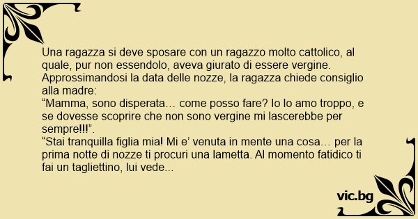 “Stai tranquilla figlia mia! Mi e’ venuta in mente una cosa… per la prima notte di nozze ti procuri una lametta. Al momento fatidico ti fai un tagliettino, lui vede il sangue e tutto e’ risolto!”.