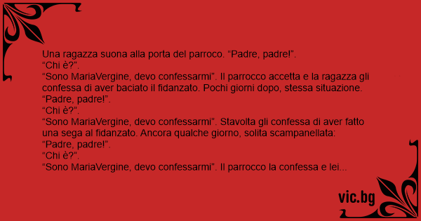 “Sono MariaVergine, devo confessarmi”. Il parrocco accetta e la ragazza gli confessa di aver baciato il fidanzato. Pochi giorni dopo, stessa situazione. “Padre, padre!”.